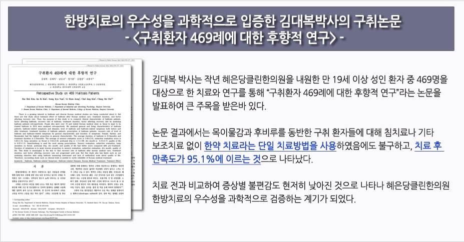 따라서 구취증이 있으면 가장 먼저 충치나 잇몸 등 구강에 다른 질환이 생겼는지 알아보고 그것을 치료해야 합니다. 하지만 구강 내 문제가 아니라면 오장육부의 균형을 바로 잡아주고 문제가 있는 장부의 치료를 서두르는 것이 구취증으로 겪는 사회생활의 불편에서 벗어나는 길입니다.
