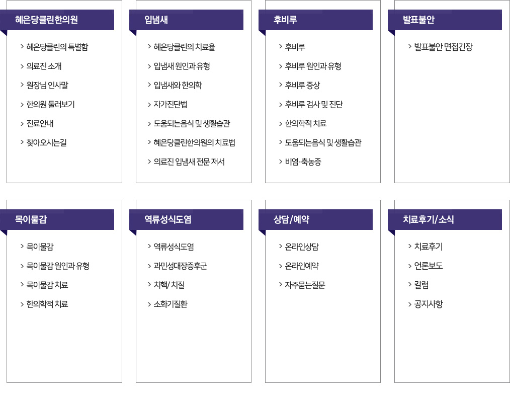 입냄새,후비루,목이물감,역류성식도염,비염,축농증,치질,소화기질환 등의 치료를 위해 혜은당클린한의원은 정성을 다합니다.