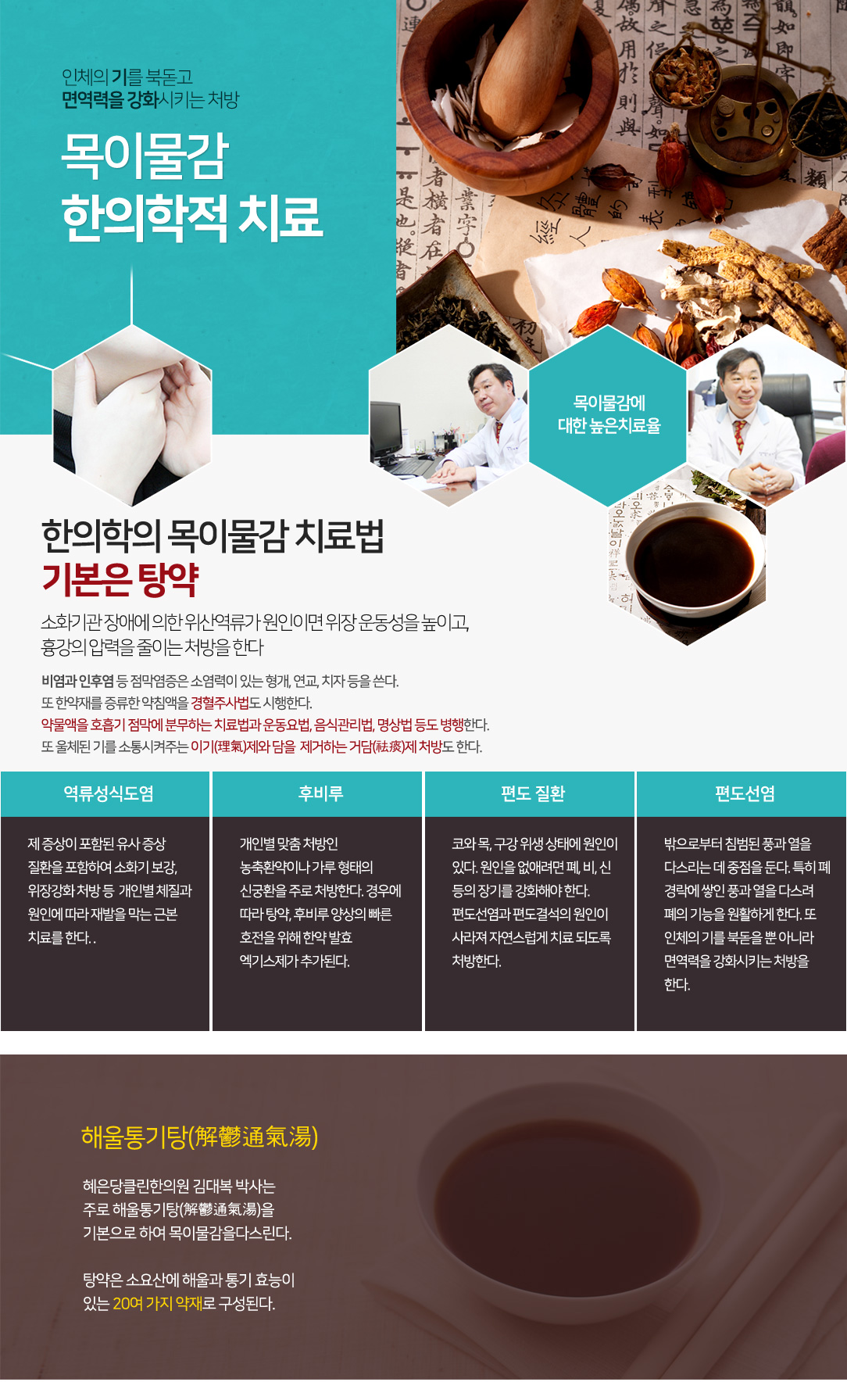 입냄새,후비루,목이물감,역류성식도염,비염,축농증,치질,소화기질환 등의 치료를 위해 혜은당클린한의원은 정성을 다합니다.